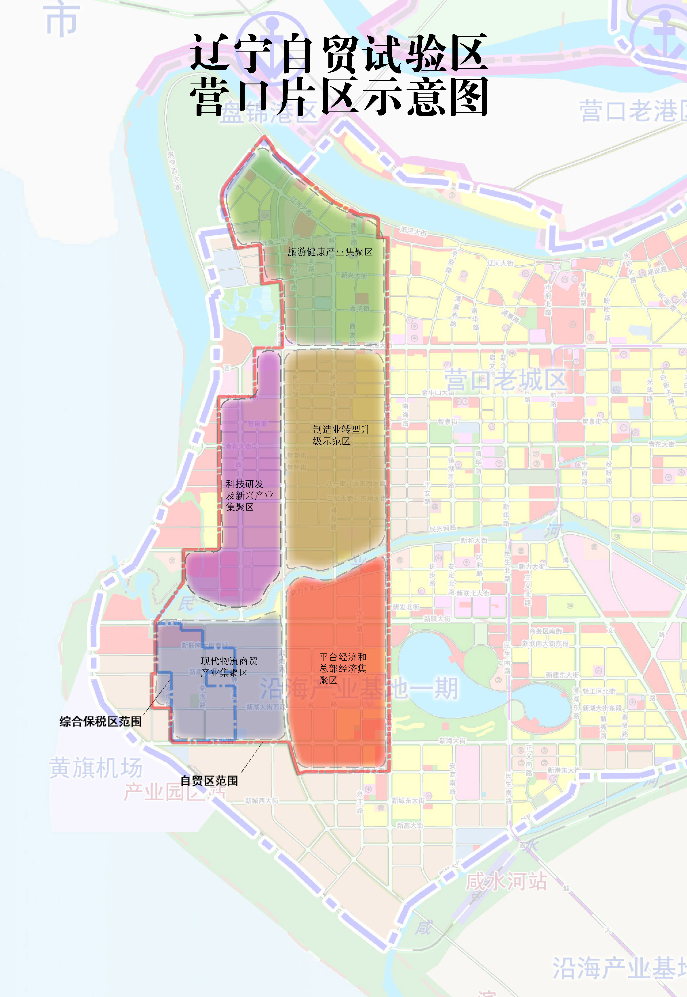 营口片区,实施范围29.96平方公里,主要位于营口市西市区(含营口综合保税区1.85平方公里),覆盖部分营口高新技术产业开发区。与辽宁沿海产业基地相邻。
